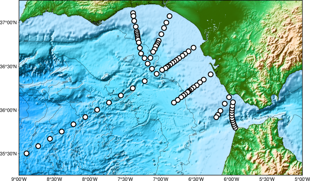 Figura 1. Distribución de los transectos y estaciones del programa STOCA en el Golfo de Cádiz. Los puntos negros indican estaciones de muestreo .